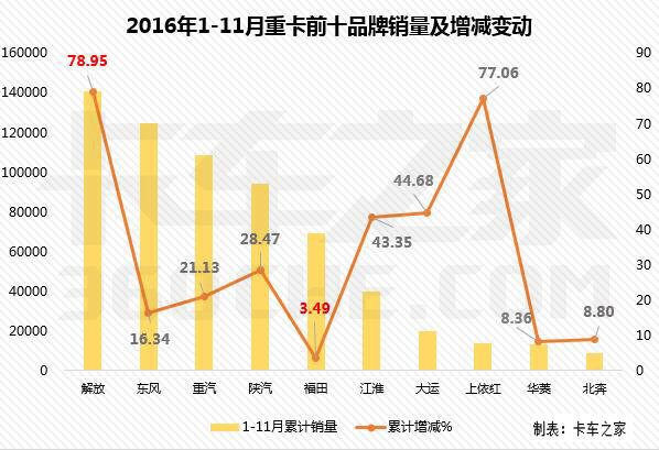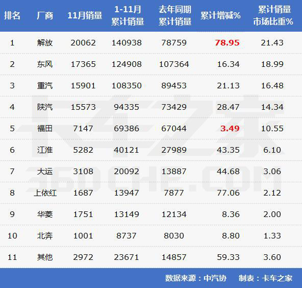 11月重卡7家銷量翻倍 解放霸主無(wú)人能動(dòng)