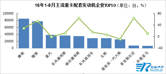 重卡配套動(dòng)力方面,從2016年1-8月份配套信息來(lái)看,配套前三的發(fā)動(dòng)機(jī)企業(yè)分別是濰柴、錫柴和重汽,累計(jì)配套量分別為8.51萬(wàn)輛、7.75萬(wàn)輛和3.85萬(wàn)輛,同比增幅分別為30.1%、54.5%和-0.3%。重卡配套前十的發(fā)動(dòng)機(jī)企業(yè)中,福田康明斯和菲亞特紅巖同比增幅均超過(guò)60%,增幅較大;道依茨一汽大柴同比下降7.7%,降幅最大。
