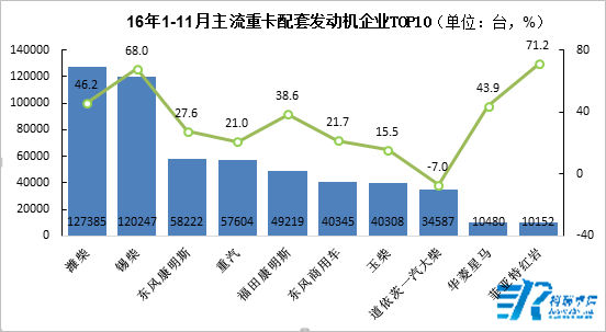 重卡配套動力方面,從2016年1-11月份配套信息來看,配套前三的發(fā)動機(jī)企業(yè)分別是濰柴、錫柴和東風(fēng)康明斯,累計(jì)配套量分別為12.74萬輛、12.02萬輛和5.82萬輛,同比增幅分別為46.2%、68%和27.6%。重卡配套前十的發(fā)動機(jī)企業(yè)中,錫柴和菲亞特紅巖同比增幅超過65%,增幅較大;道依茨一汽大柴同比下降7.0%,降幅最大。