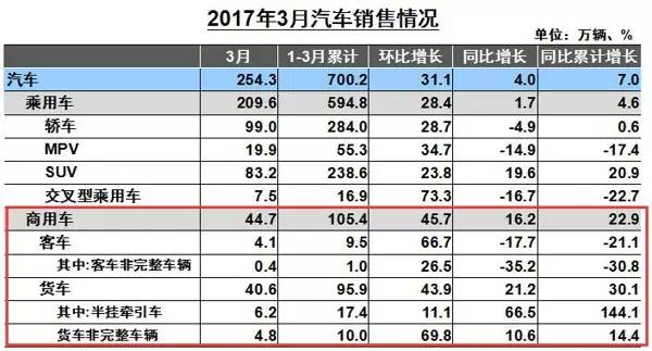 3月,在商用車主要品種中,與上月相比,客車和貨車產(chǎn)銷均呈兩位數(shù)較快增長,其中客車增速更為明顯;與上年同期相比,客車產(chǎn)銷繼續(xù)下降,貨車保持較快增長。