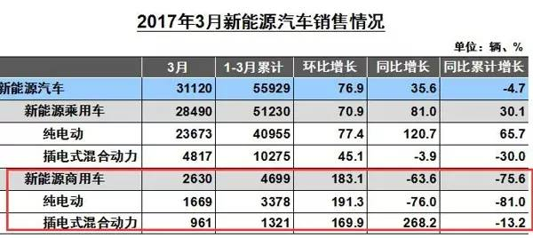 3月新能源商用車銷售2630輛,同比下降63.6%;1-3月份,新能源商用車?yán)塾?jì)銷售4699輛,同比下降75.6%。其中,1-3月,純電動商用車?yán)塾?jì)銷售3378輛,同比下降81%;插電式混合動力商用車銷售1321輛,同比下降13.2%。